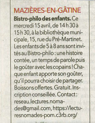 Un moment ludique et convivial attend les enfants de 5 à 8 ans à la bibliothèque de Mazières-en-Gâtine avec le Bistro-philo : histoire, échanges et goûter partagé au programme.